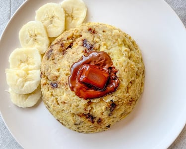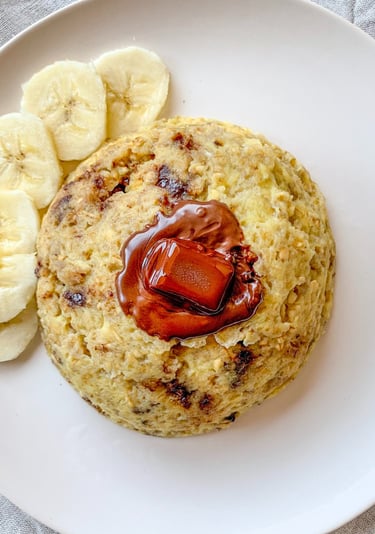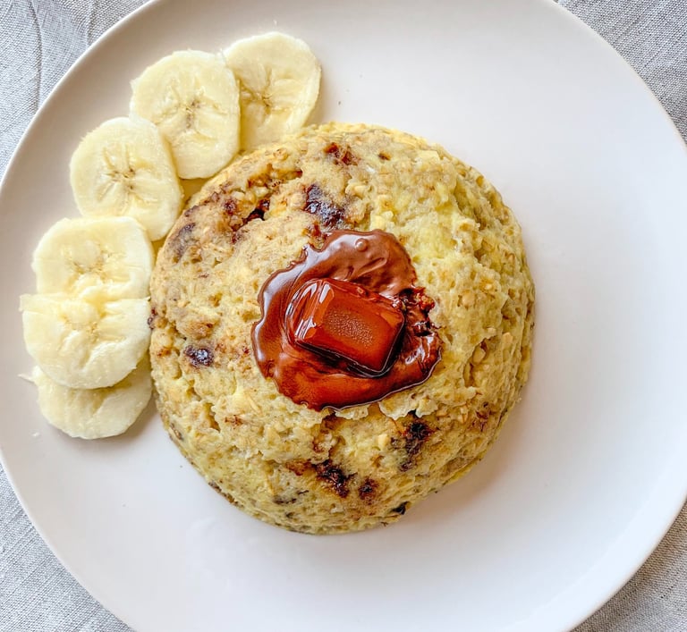 Recette du bowl cake : flocons d'avoine, 1 banane, 2 oeufs, 2 cuillères de skyr, mélanger et placer au micro onde 3 minutes.